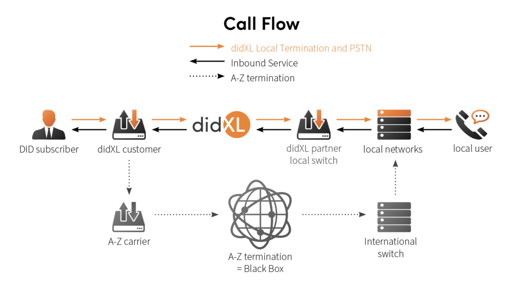 Outbound Services allow didXL customers to use our DID numbers for outbound calls, as well. Local Termination Service offers two-way-voice functionality with domestic call capabilities, PSTN Replacement Service enable calls to Emergency Service. Calls will be routed directly via the network of the in-country DID number owner.